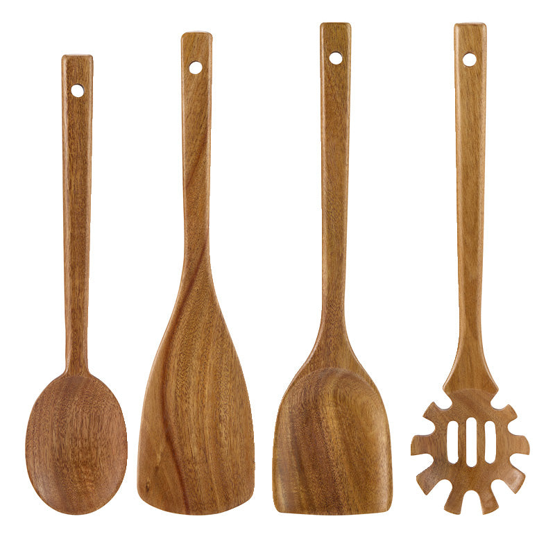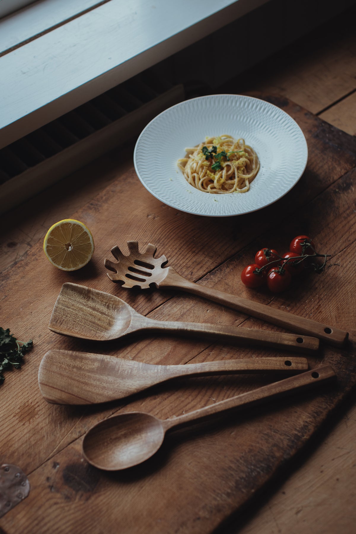 Rey redskapsset i akaciaträ innehåller pastaslev, stekspade och två kombinerade slevar. Det hållbara träet ger en varm känsla och är skonsamt mot kastruller och pannor. Ett stilfullt, funktionellt set som passar daglig matlagning och ger ett naturligt uttryck i köket.