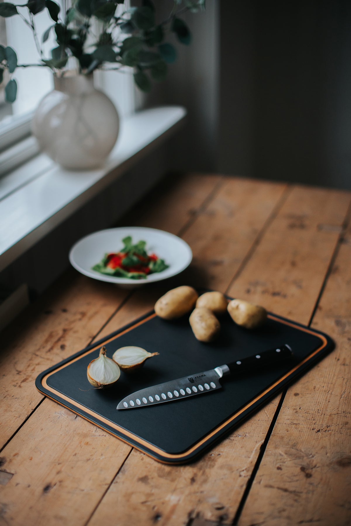 Sami Skærebræt er fremstillet af hårdtpresset cellulose, hvilket giver en slidstærk og hygiejnisk overflade, der er skånsom mod knivene. Med sin større størrelse på 37 x 27,5 cm tilbyder det rigelig arbejdsplads til madlavning, hvilket gør det ideelt til både store og små opgaver. Materialet er naturligt antibakterielt og tåler høje temperaturer, hvilket gør det perfekt til daglig brug.