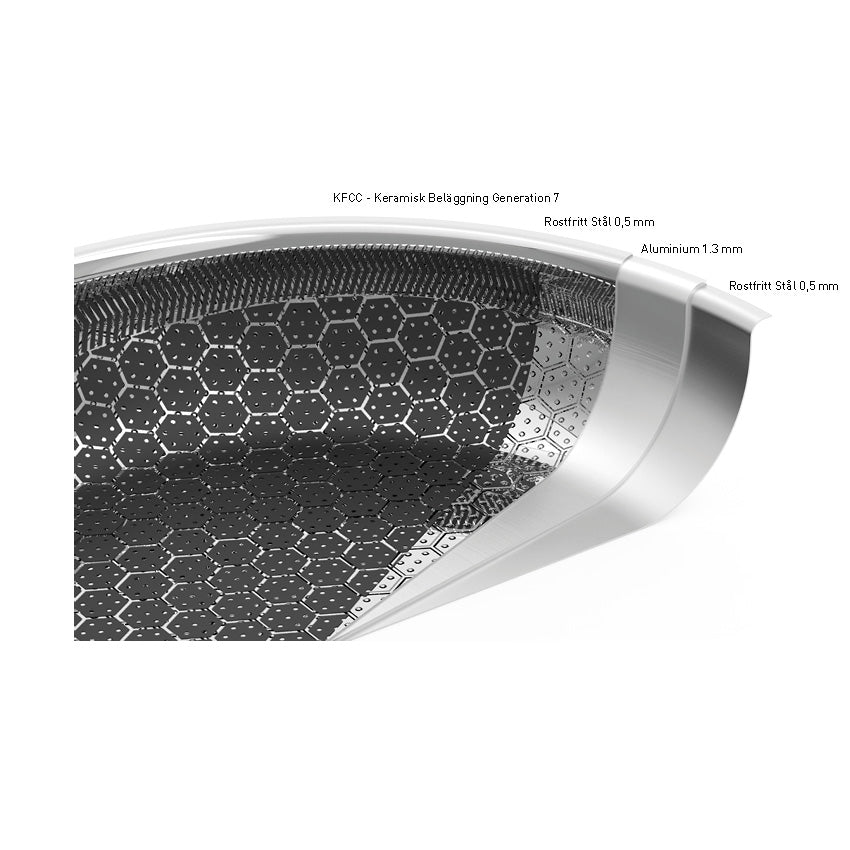 Eminence Traktørpanne Ø30 cm er ideell for steking, sautering og brasing. Den keramiske belægningen er fri for PFAS og gir utmerket non-stick. 3-Ply-konstruksjonen med aluminiumkjerne gir jevn varmefordeling. Det medfølgende lokket bevarer varme og fukt, og HoneyComb-mønsteret gir en jevn stekeoverflate.
